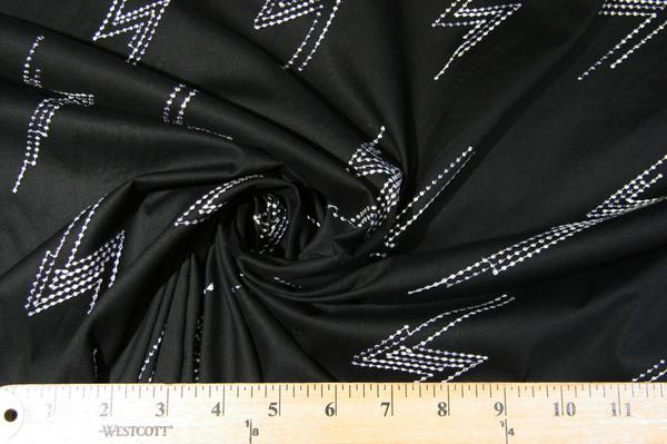 This is a solid black cotton poplin embroidered with large lightening bolts. The thread used to create the lightening bolts, varies from white to a medium grey. The background fabric does provide stretch and would be perfect for making blouses, dresses, lightweight skirts, unconstructed jackets, lightweight curtains, shirts, costumes, lining, craft projects, pillows, throw pillows, children’s apparel, etc. Disclaimer: Please see our FAQ Page to learn more about our policies & other disclaimers, important to know when purchasing fabrics from us. If you require verification of content, please consider ordering swatches & testing them yourself, before making a purchase (see the FAQ Page for our Swatch Policy.)